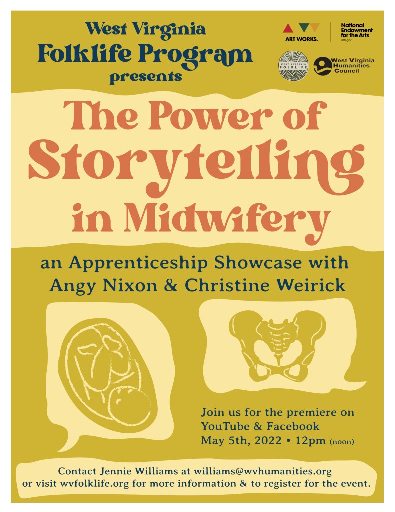 Please join us at noon on Thursday, May 5th –The International Day of the Midwife– for a pre-recorded apprenticeship showcase featuring midwife Angy Nixon of Putnam County and her apprentice Christine Weirick of Fayette County. The pair recently completed their 2020-2021 apprenticeship with the West Virginia Folklife Program. Read about their apprenticeship here.