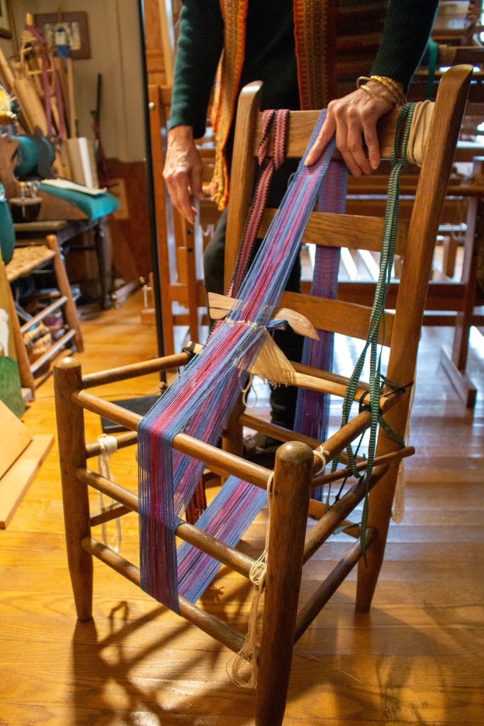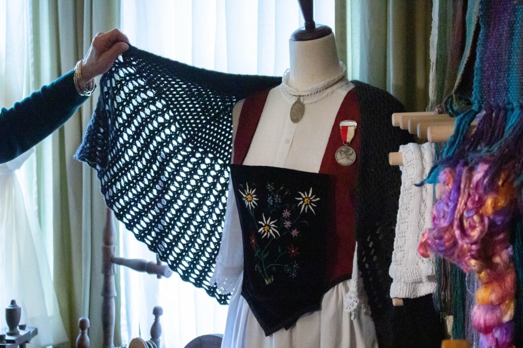 These days, Enrica’s Elkins home is filled with traditional tools, fleece and naturally dyed yarn, and works in progress. “My house has more UFOs than Area 51!” as Enrica jokingly refers to “unfinished objects.” Parked along the walls are antique walking wheels and smaller spinning wheels from West Virginia and many parts of the world, wheels made from found objects, baskets made of local plant materials she’s made or collected, and recycled denim as furniture upholstery. Just about everything on display, including a stunning traditional Swiss outfit, Enrica made by hand.