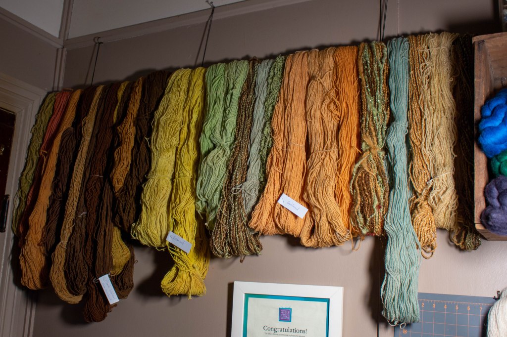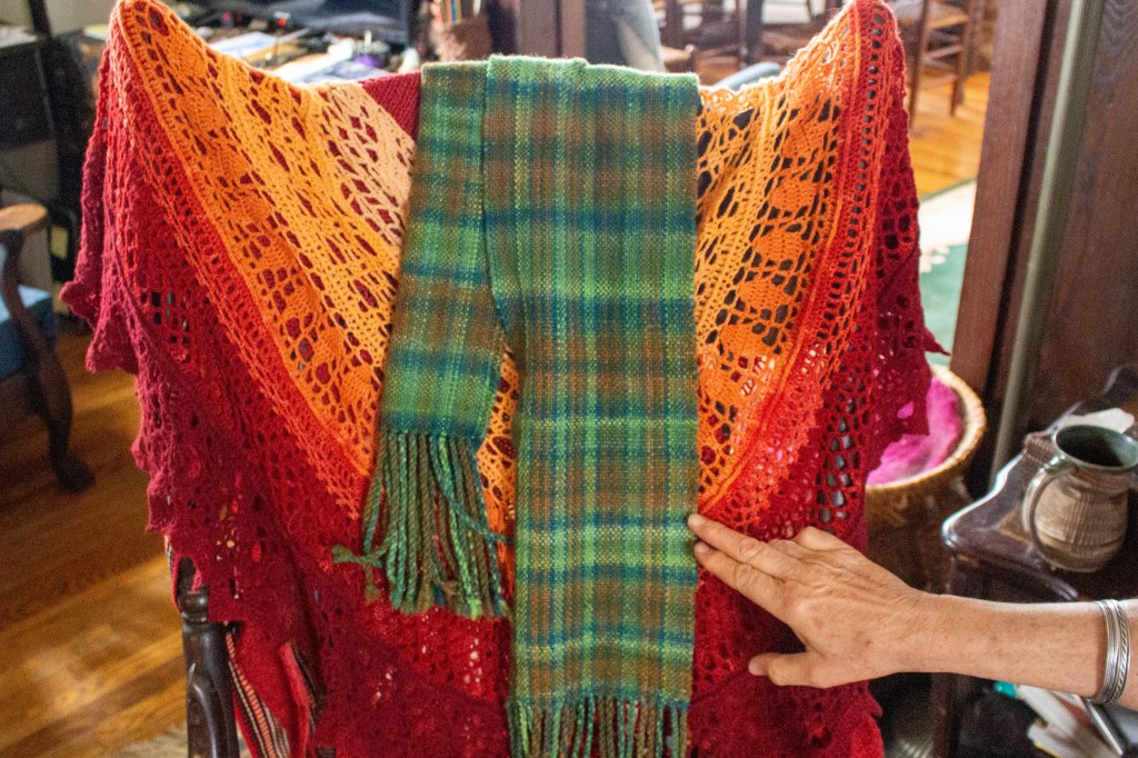 Fiber arts can be highly technical and creatively freeing. “Sometimes I am very rule driven, very measured,” Enrica explains. “I know exactly what I want at the end and know exactly how to get there.” Enrica continually taps into and adapts the skillsets she learned from her grandmothers. “Enrica is always upping the ante,” Barbara observes. “It’s kind of mind blowing, actually.” Enrica has perfected using traditional methods of preparing fibers for weaving, but she experiments and can dye a colorful gradient into the fleece before arranging, spinning, and weaving it. By using a single skein of carefully dyed yarn, she is able to produce a scarf with a brilliant faux plaid effect without changing out different sets of colors. “I’m still inventing,” Enrica says.