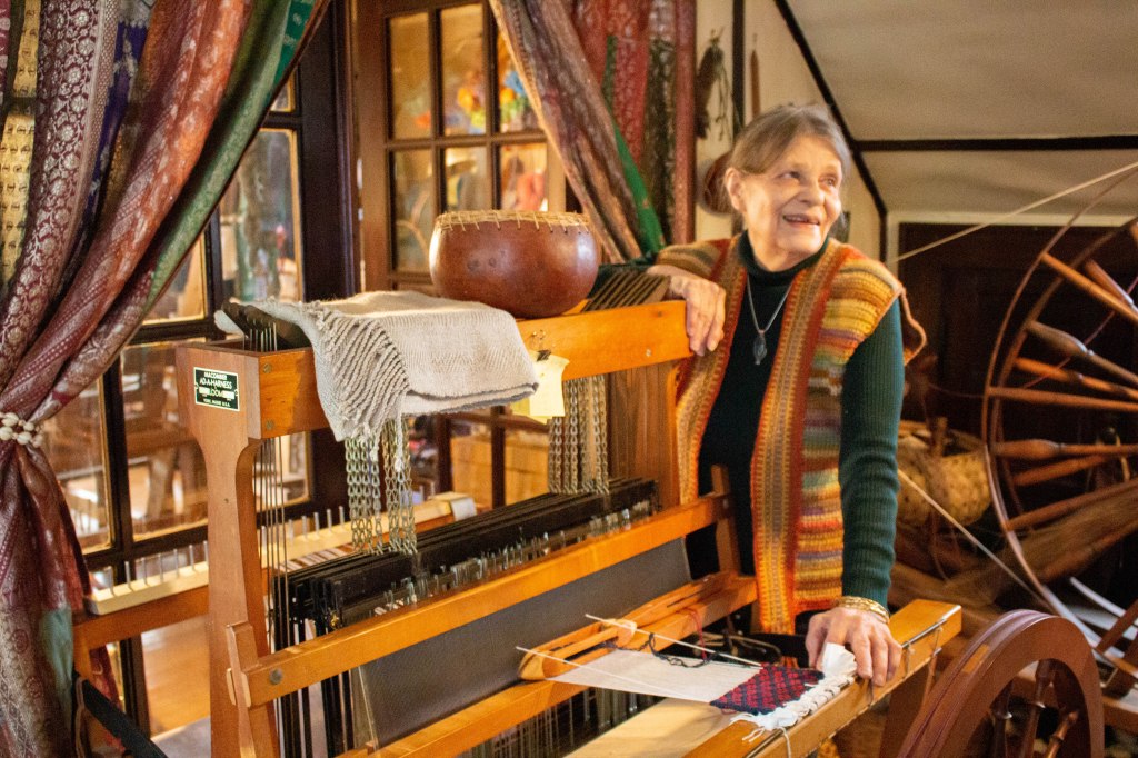 Born in Helvetia in 1952, Enrica “grew up with a foot in each century,” as she sees it. “There were still a lot of people living just as they had in 1900. It was normal life.” She first learned fiber arts traditions from her paternal grandmother Henrietta Hartmann Hofer, whose family was among Helvetia’s original Swiss settlers. Her maternal grandmother Susanna Cutright Vangilder lived a few miles down the road in Czar and could trace her ancestors back to West Virginia’s earliest settlers. Curious and observant, Enrica learned how her grandmothers practiced similar traditions in different ways. “Grandmothers have a way of talking about what they’re doing while they’re doing it.” Both spun, wove, quilted, and practiced needle arts. While young girls were expected to knit, crochet, and embroider, it wasn’t necessary for them to spin yarn, yet she begged her Swiss grandmother to teach her. “I like the fluidity of spinning,” she says. “It’s very hypnotic and very relaxing to me.” Spinning is rhythmic like dancing, and there are certain types of music one can listen to while spinning to keep time. “When you dance, you count.”