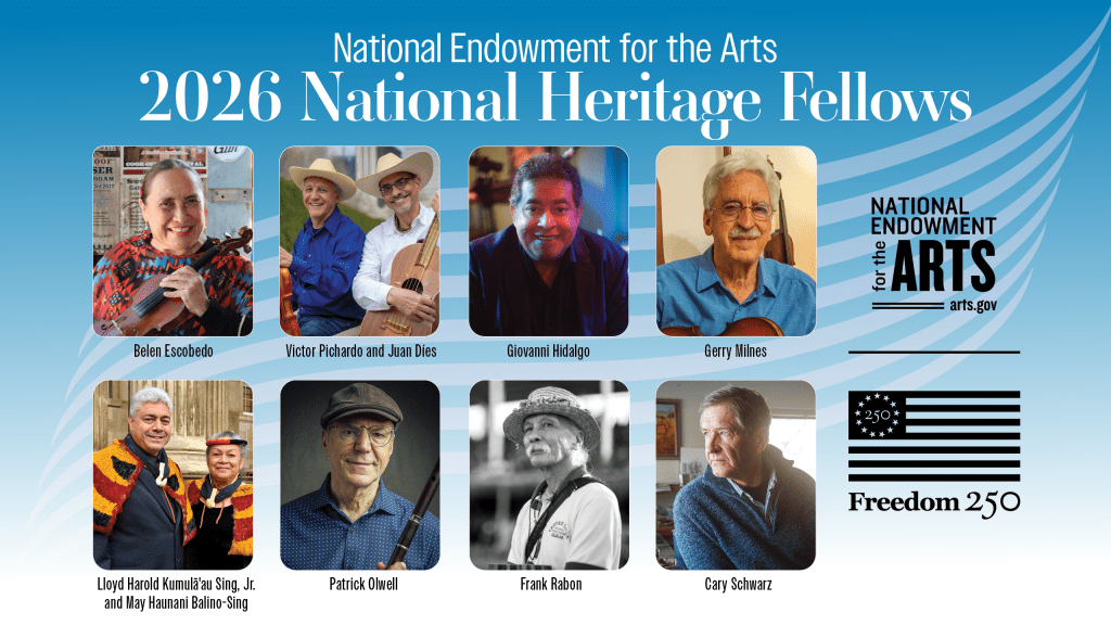 The other 2026 National Heritage Fellows are Juan Díes and Victor Pichardo, Mexican folk musicians of Chicago; Belen Escobedo, a Conjunto Tejano fiddler from San Antonio, Tex.; Giovanni Hidalgo, a Latin percussionist from Ocoee, Fla.; Lloyd Kumulā‘au Sing, Jr. and May Haunani Balino-Sing, Hawaiian twined basketry artists of Wahiawā, HI; Patrick Olwell, flutemaker of Nellysford, Va.; Frank Rabon, CHamoru dancer and choreographer of Hagåtña, Guam; Cary Schwarz, saddlemaker and leather artist of Salmon, ID.
